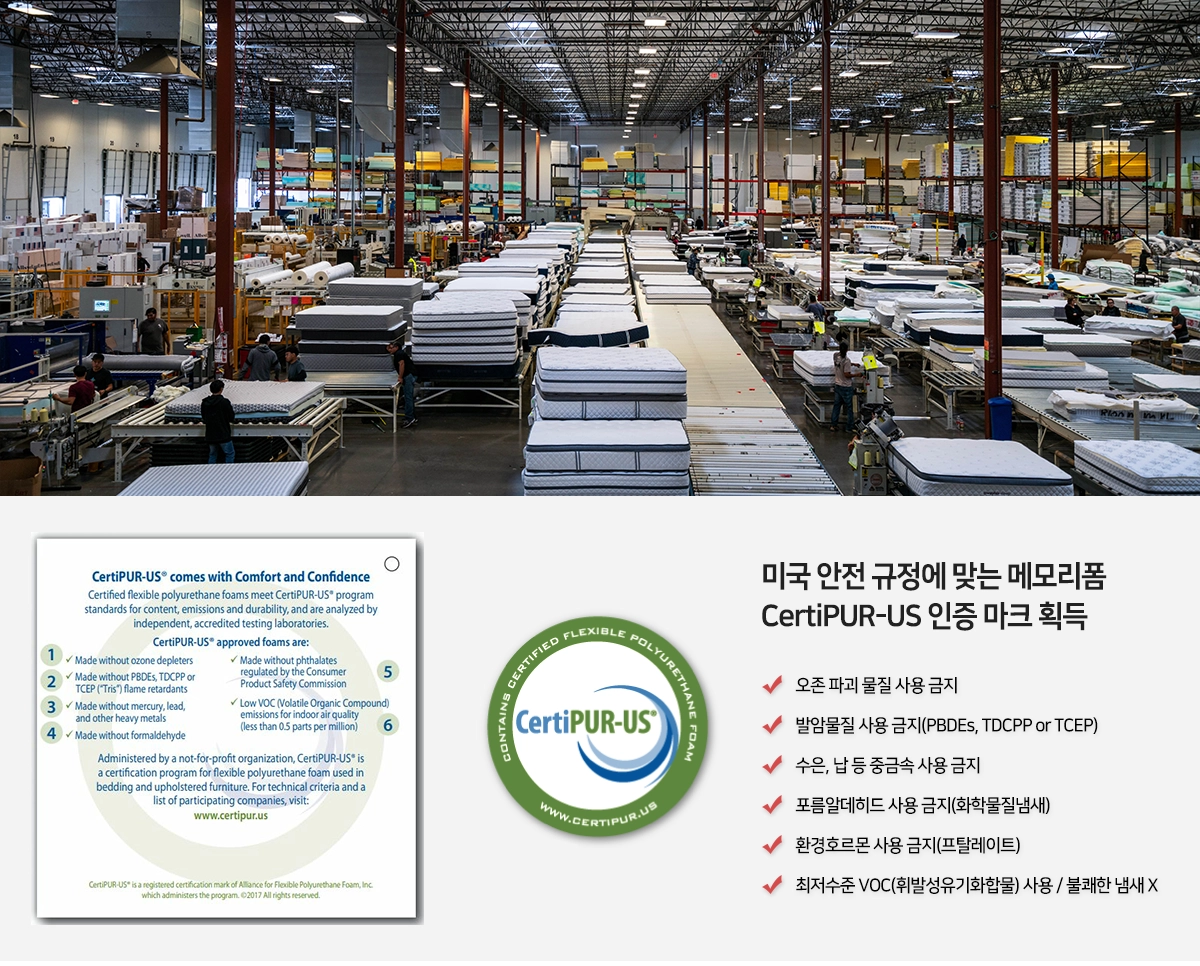 미국 매트리스 제작 및 판매 규정은 환경오염에 문제가 되는 소재와 재료 사용이 법으로 금지되어 있습니다. 특히 메모리폼에 관해서는 CertiPUR-US의 환경오염물질의 사용금지 규정에 따라 CertiPUR-US 인증을 받아야만 매트리스를 생산해서 판매 할 수 있습니다.